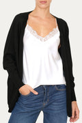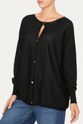 Cardigan che unisce la leggerezza della lana pregiata a un design minimal e sofisticato nella sua variante nero, senza tempo.