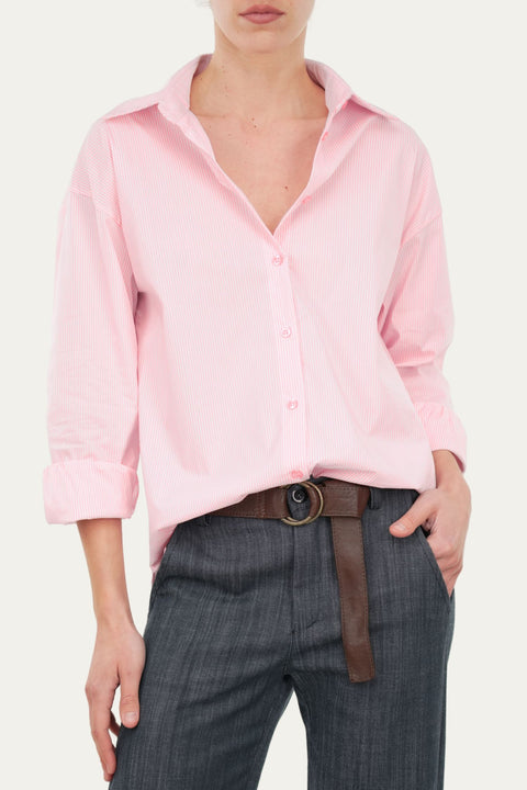 In una raffinata fantasia a righe confetto e bianche, questa camicia è un capo versatile e contemporaneo, perfetto per arricchire ogni guardaroba. Il tessuto leggero e piacevole al tatto offre una vestibilità comoda, garantendo freschezza e libertà di movimento. Il taglio regolare segue con naturalezza la linea del corpo, donando un look curato ma disinvolto. Le sottili righe verticali aggiungono un tocco sofisticato, rendendola ideale sia per outfit casual che per abbinamenti più eleganti.
