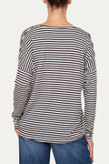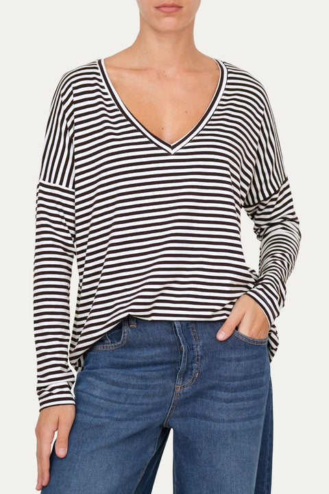 In una tonalità moro intensa e sofisticata, questa maglia esprime eleganza senza tempo. Il motivo a righe regala profondità e movimento, mentre la vestibilità over e la viscosa morbida assicurano comodità assoluta. Ideale per look raffinati ma pratici, perfetti dall’ufficio al tempo libero.