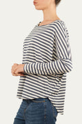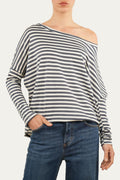 Una combinazione delicata e versatile per questa maglia a righe bianco e jeans. Il taglio asimmetrico e lo scollo a barca la rendono femminile e moderna. Morbida e leggera, è un capo jolly che si abbina con tutto.