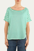 Maglia in cotone con scollo a barca e maniche corte, con un elegante motivo a righe Smeraldo, ideale per la stagione estiva. Un capo versatile che dona un look fresco e casual.