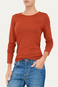 Questa maglia girocollo in morbida viscosa ruggine avvolge il corpo con una sensazione di leggerezza e comfort, mantenendo una linea semplice e pulita. Il girocollo valorizza il décolleté con naturalezza, mentre la vestibilità dritta la rende perfetta sia da indossare da sola che sotto giacche e cardigan.