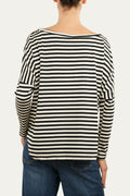 Righe senza tempo per una maglia versatile e raffinata. Lo scollo a barca e la linea fluida donano femminilità e libertà di movimento. Il contrasto bianco e nero aggiunge eleganza al design minimal, ideale per ogni occasione.