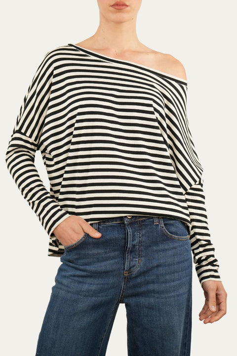 Dettagli: scollo a barca, taglio asimmetrico, fantasia a righe bianco e nero