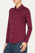 Elegante e raffinata, questa camicia in jersey di viscosa unisce comfort e stile con un tocco contemporaneo. Il taglio semplice con collo classico e chiusura a bottoni in madreperla, valorizza la figura con naturalezza, mentre il colore vino aggiunge una nota calda e sofisticata. Perfetta per look versatili, dal quotidiano agli abbinamenti più ricercati.