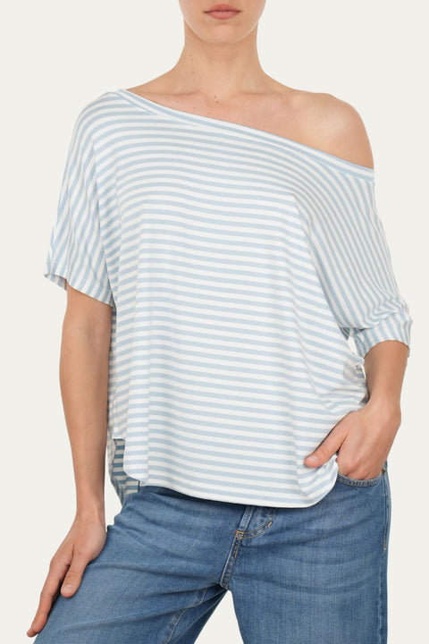 Maglia a maniche corte a righe Cielo, può essere indossata regolarmente o con una spalla scesa che dona un look più sensuale e casual.