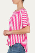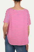 Maglia a maniche corte a righe Fucsia, può essere indossata regolarmente o con una spalla scesa che dona un look più sensuale e casual.