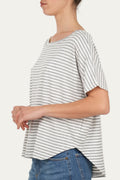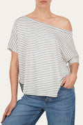 Maglia a maniche corte a righe Perla, può essere indossata regolarmente o con una spalla scesa che dona un look più sensuale e casual.