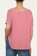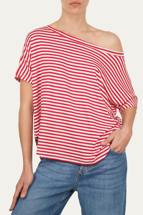 Maglia a maniche corte a righe Rosso, può essere indossata regolarmente o con una spalla scesa che dona un look più sensuale e casual.