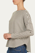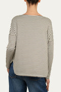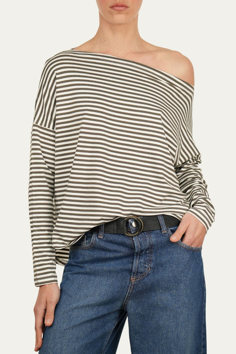 Questa maglia a righe Florida bianco e salvia, può essere indossata sia regolarmente che con una spalla scesa, che dona un look più sensuale e casual.