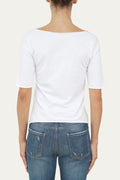 Realizzata in morbido cotone elasticizzato, si accosta alla figura senza stringere, offrendo comfort e libertà di movimento. Le linee pulite, il taglio vivo e lo scollo a barca le donano un aspetto moderno e minimal.