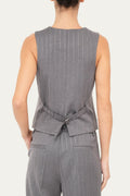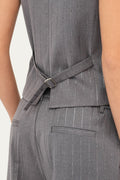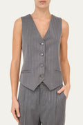 In un raffinato tessuto gessato grigio dalla linea elegante, questo gilet si distingue per la trama sottile a righe verticali che slancia la figura e dona un tocco classico al capo. Il taglio regolare con scollo a V mette in risalto la silhouette, mentre la chiusura con cinque bottoni frontali aggiunge struttura al design. Tasche anteriori a filetto. Sul retro è presente un cinturino regolabile che permette di adattare la vestibilità in base alle proprie esigenze. Perfetto da indossare da solo oppure abbinato a camicie e blazer per un completo più ricercato.