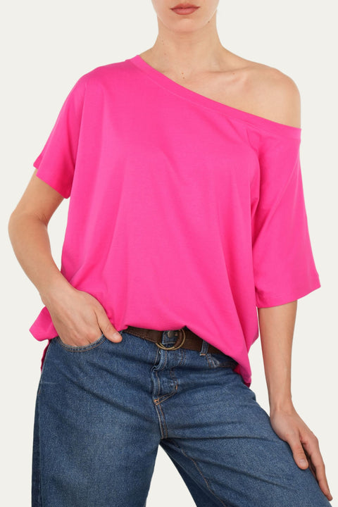 Maglia scollo a barca maniche corte Cotone - Fuxia
