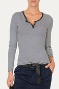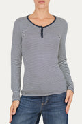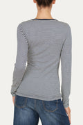 Lo scollo tondo è arricchito da tre piccoli bottoni decorativi, mentre il colletto, in tinta unita, riprende il colore delle righe per un effetto armonioso e raffinato.