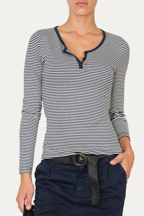 Maglia in morbida viscosa a righe sottili, dal design semplice ma ricercato.
