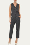 Realizzato in un raffinato tessuto gessato antracite con delicati fili di lurex che donano una luminosità discreta e sofisticata, questo pantalone boyfriend rappresenta l’eleganza maschile in chiave contemporanea. La linea morbida e leggermente affusolata regala un look rilassato ma sempre curato, mentre l’elastico posteriore in vita assicura comfort e vestibilità ottimale per tutta la giornata.