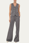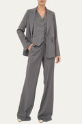 Raffinato e contemporaneo, il pantalone palazzo gessato grigio con lurex è un capo che coniuga eleganza senza tempo e comfort moderno. Realizzato in un pregiato tessuto gessato arricchito da sottili fili di lurex, dona un tocco luminoso e sofisticato al look. La linea fluida scende dritta lungo la gamba, slanciando la figura con naturalezza e regalando una silhouette armoniosa e femminile.