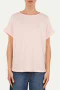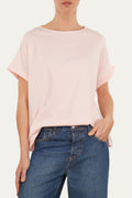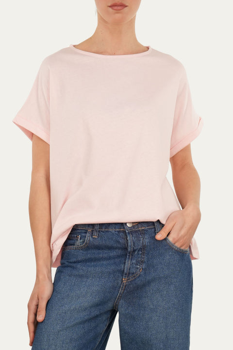 T-shirt a barchetta in morbido cotone Rosa Confetto, taglio svasato e maniche corte con risvolto. Dona un look casual e sbarazzino.