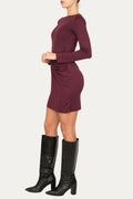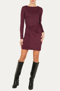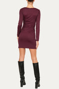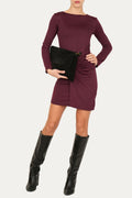 In una tonalità amarone calda e magnetica, questo tubino esprime eleganza e carattere. Con la sua linea essenziale e il dettaglio intrecciato sul punto vita scolpisce delicatamente la silhouette. Il tessuto morbido ed elasticizzato valorizza le curve senza costringerle, creando un effetto slanciato e sinuoso. Lo scollo girocollo e le maniche lunghe lo rendono un capo versatile, femminile, sofisticato e sicuro di sé.