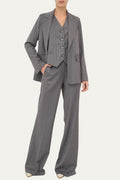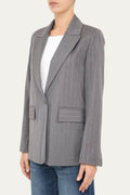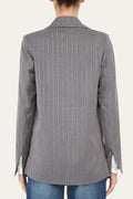 In un sofisticato tono antracite con sottili righe gessate illuminate da un delicato filo lurex, questo blazer si distingue per il suo equilibrio tra eleganza classica e modernità. La struttura della giacca richiama il taglio maschile con il retro lineare e poco sfiancato, offrendo una vestibilità confortevole e versatile. I dettagli sartoriali, come il rever classico, la chiusura monopetto e le tasche a pattina, aggiungono carattere al design, mentre la linea pulita e allungata valorizza la figura senza costringerla.