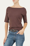 Realizzata in morbido cotone elasticizzato, si accosta alla figura senza stringere, offrendo comfort e libertà di movimento. Le linee pulite, il taglio vivo e lo scollo a barca le donano un aspetto moderno e minimal.